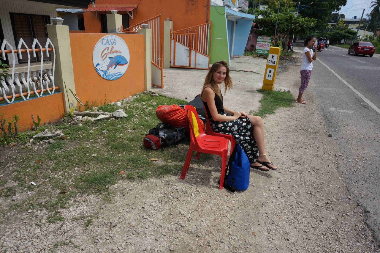 Mit dem Bus sollte es weiter nach Moal Boal gehen an die Westküste von Cebu Island. Eine Busfahrplan gibt es nicht und eine Haltestelle auch nicht. Man stellt bzw. in meinem Falle setzt sich einfach an die Straße mit seinem Gepäck, wartet bis der Bus vorbei fährt und winkt. Hat super geklappt.