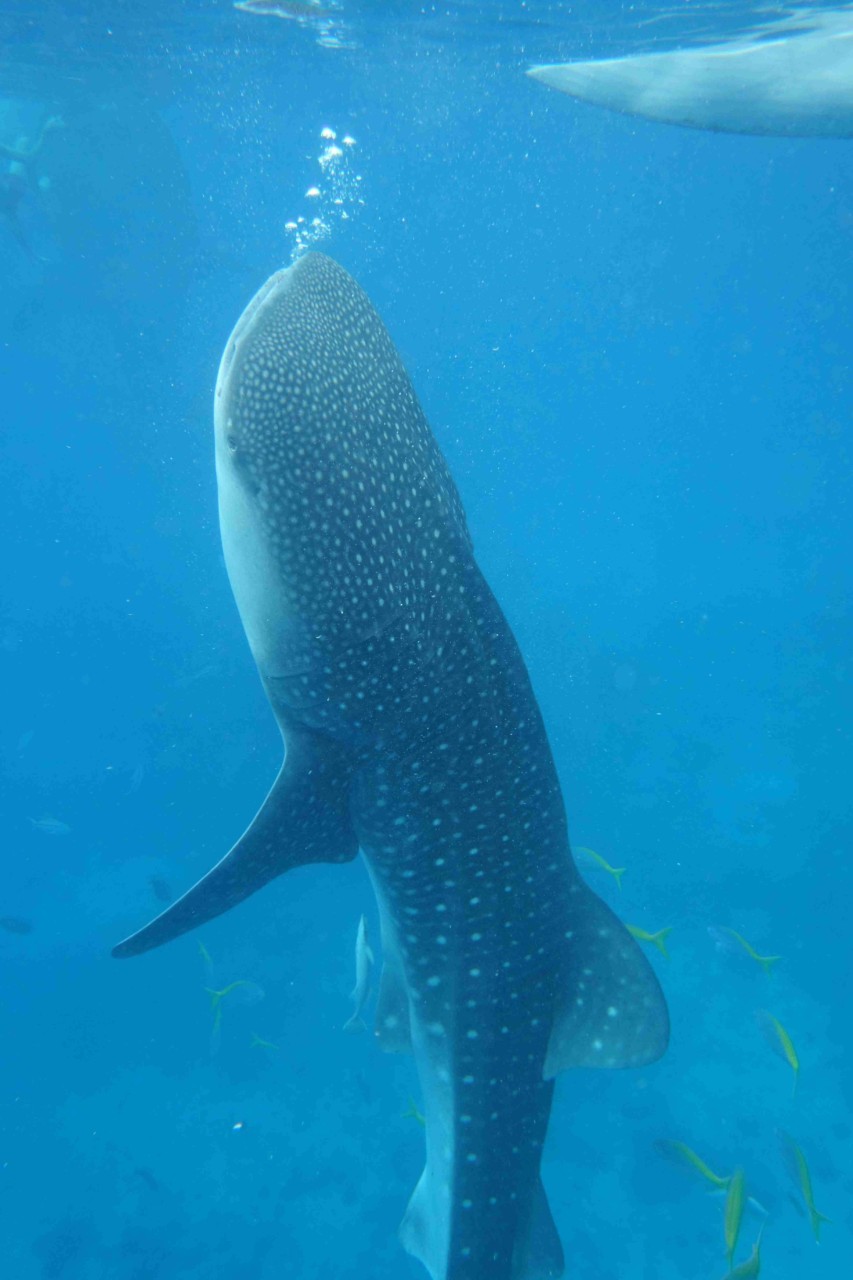 Wir sind früh um sechs gleich mit dem ersten Boot einige Meter raus aufs Meer gefahren worden und hatten ca. 8 der Riesenexemplare um uns. Trotz der fragwürdigen Umstände ein unglaubliches Erlebnis. Die Tiere hatten eine Größe bis zu 9 Metern, können aber noch ein ganzes Stück größer werden. Somit sind Walhaie die größten Fische der Welt. Sie ernähren sich von Plankton und sind für den Menschen ungefährlich. Sie stellen sich senkrecht im Wasser auf, öffnen ihr bis zu 1,5m großes Maul und filtern durch die Kiemen das Plankton aus dem Wasser, von dem sie sich ernähren. Ein faszinierendes Schauspiel.